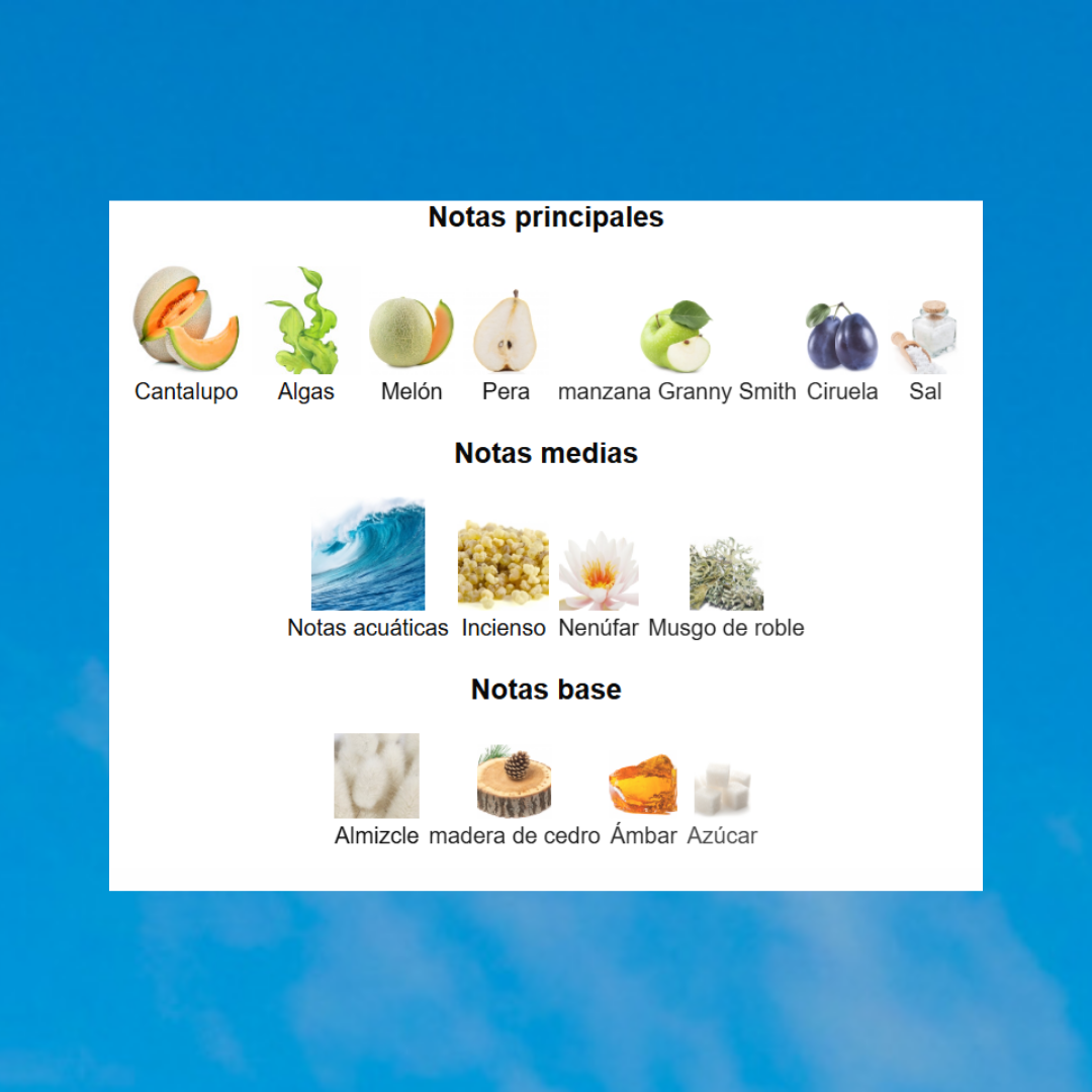 Notas de Salida: Cantalupo, algas, melón, pera, manzana, ciruela y sal.