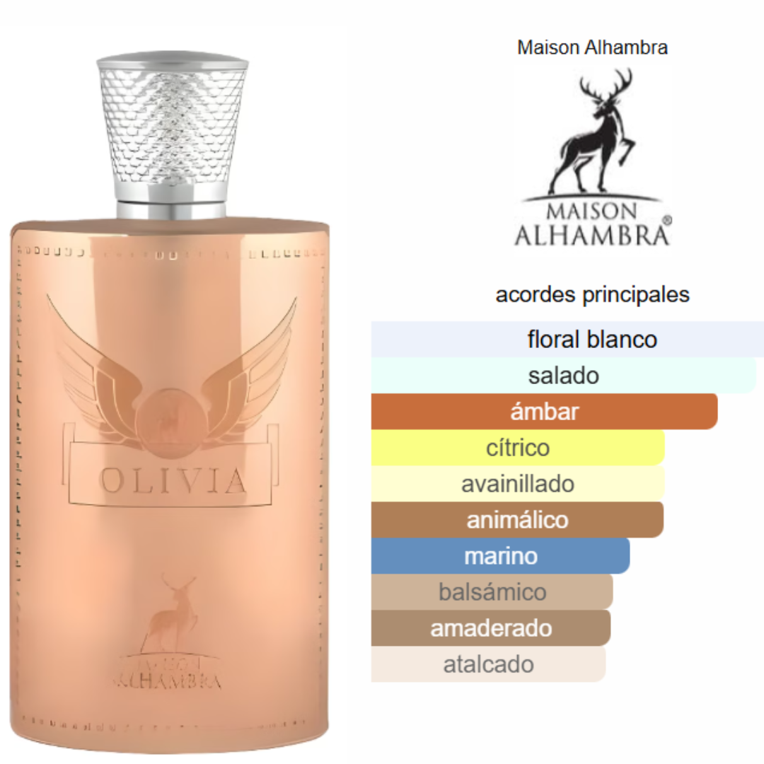 Descubre Olivia, un eau de parfum floral y femenino de Maison Alhambra que envuelve con elegancia y calidez. Sus notas de salida combinan jazmín de agua, flor de jengibre y mandarina verde, despertando los sentidos con frescura y delicadeza. El corazón revela una mezcla suave de sal y vainilla que añade profundidad y sofisticación. Finalmente, el fondo amaderado de ámbar gris, madera de cachemira y sándalo aporta un toque duradero y refinado, haciendo de esta fragancia un homenaje olfativo a la feminidad y el poder.