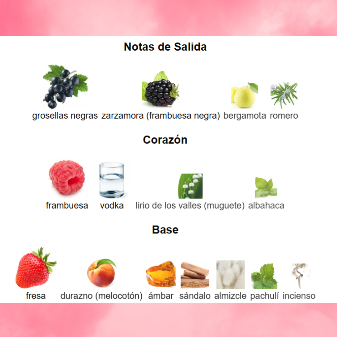 Notas de Base : Fresa, melocotón, sándalo, incienso, ámbar, pachulí y almizcle.