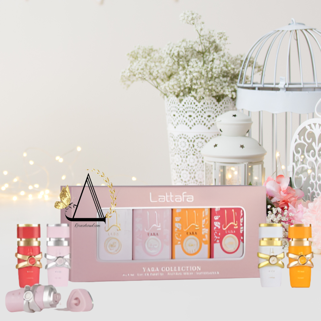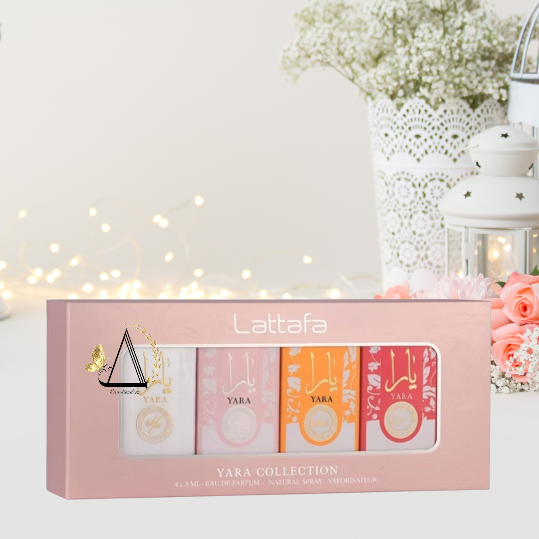 La casa Lattafa presenta la exclusiva colección Yara, diseñada para los coleccionistas de perfumes en miniatura. Este set incluye cuatro mini tallas de 5 ml cada una, con las fragancias más emblemáticas: Yara Rosa, Moi, Tous y Candy. Perfecto para descubrir o renovar tu repertorio olfativo sin comprometer espacio. Una selección precisa que refleja la esencia y calidad de Lattafa en un formato compacto y elegante, ideal para llevar o regalar. Imprescindible para los amantes del perfume que buscan variedad y distinción en cada aroma.