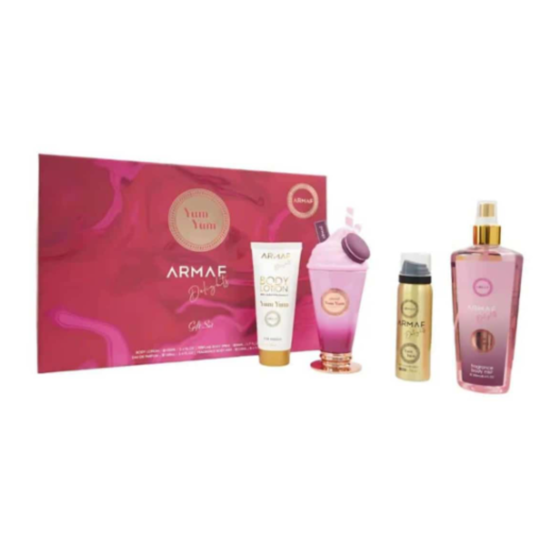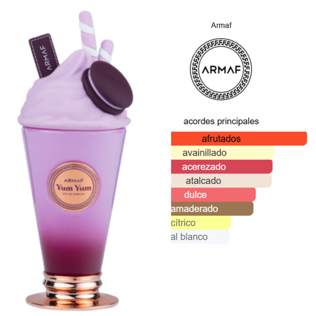 Armaf Yum Yum es una fragancia cautivadora que combina cítricos vibrantes y cereza jugosa con un corazón de rosa y flores blancas. Su suavidad atalcada se complementa con una cálida base de vainilla y ámbar. Los matices afrutados y almizclados aportan profundidad, creando un aroma elegante e irresistible.